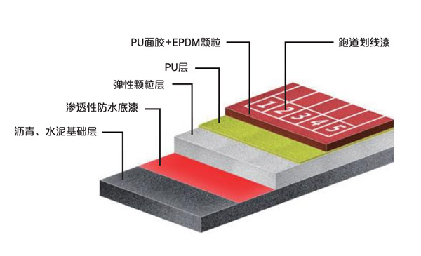 大亨環(huán)保無(wú)毒復(fù)合型塑膠跑道采用EPDM顆粒加聚氨酯膠水混合攤鋪,固化后再使用跑道底料封閉底層,防止噴面過(guò)程中跑道面漆液體料下滲。面層為專(zhuān)用跑道面漆和EPDM顆?;旌虾髧娡慷伞?