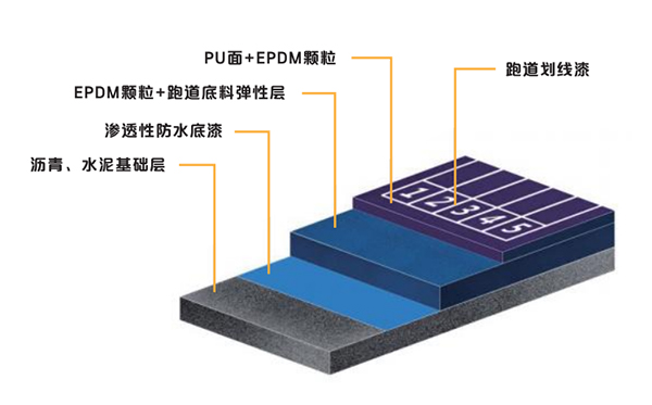 1、大亨環(huán)?;旌闲退苣z跑道采用雙組份PU底料混合EPDM顆粒為底層,面層為EPDM顆粒與雙組份聚氨酯跑道面漆結(jié)合噴涂。