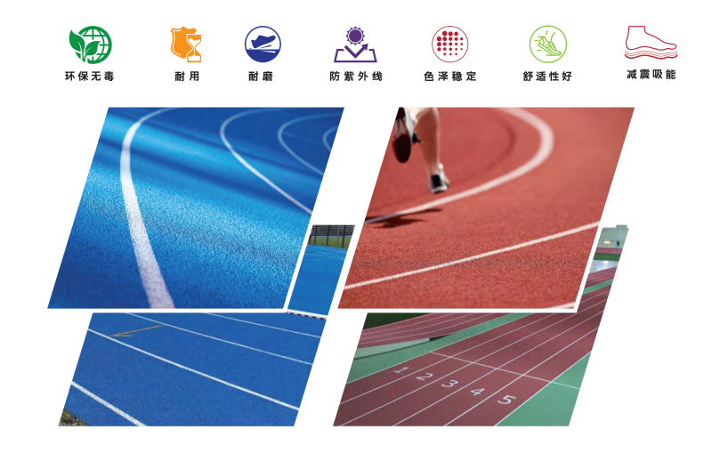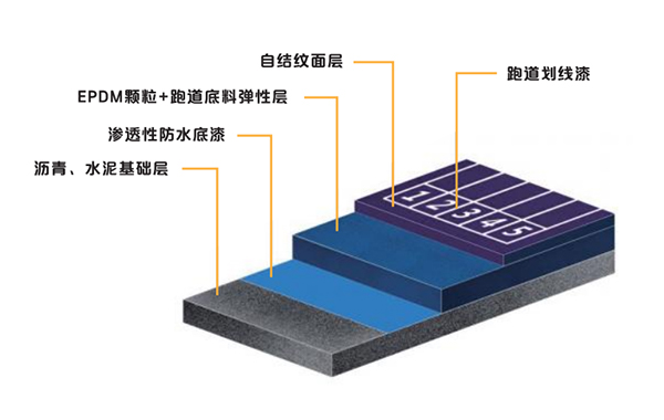 2、此類型跑道面層使用專業(yè)自結紋面漆噴涂,不添加EPDM顆粒,使面漆的耐老化、耐磨度大 大提高。