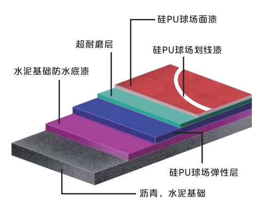 2、大亨新材的高彈性硅PU球場材料具有環(huán)保、超耐磨、耐酸耐堿、抗老化性能優(yōu)越等特性,彈性層和面漆層中間使用超耐磨層的結(jié)構(gòu)設計。超耐磨層使用植物化工的產(chǎn)品為原材料,可以使面漆完全滲透進超耐磨層內(nèi)融為一體,也可以很好的隔絕彈性層,使面漆的粘接力更強避免面漆的發(fā)黑發(fā)污,始終保持鮮艷如初。